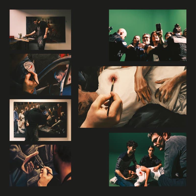 Sept peintures à l'huile de Jaeraymie. Chaque panneau explore une facette de la mécanique de l'article L.435-1 : la loi, le récit, la sidération, la collusion, la survie, l'impunité, l'utopie.
